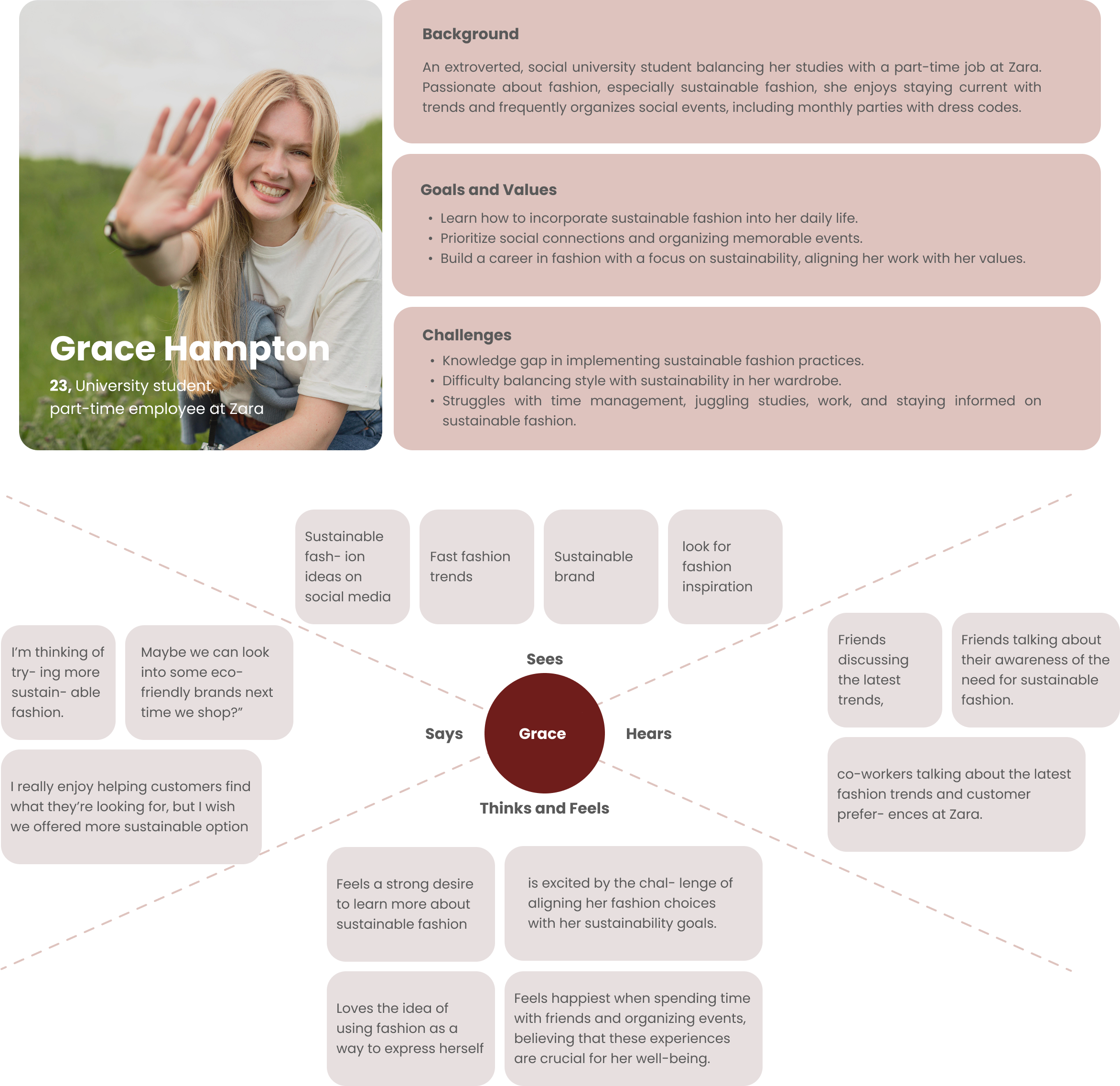 I conducted user interviews with six females aged 18–25 to gain insights into their experiences. All participants are socially active—whether working, studying, or attending social events—and have an interest in sustainable fashion.