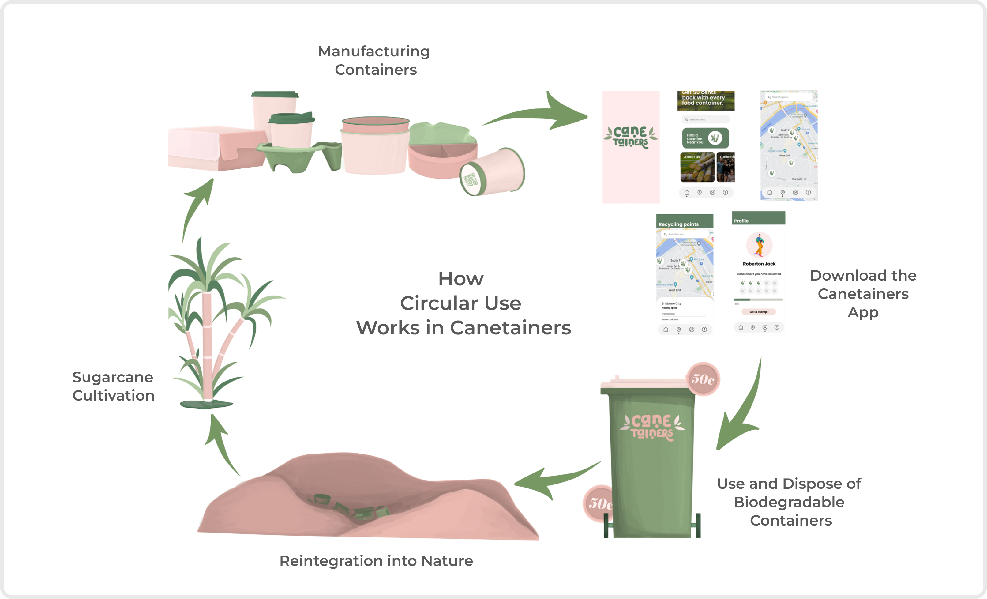 Canetainers is a sugarcane-based takeaway packaging brand and mobile app that supports a circular recycling system. By linking sustainable packaging with a digital experience, the project encourages better recycling habits in everyday life.