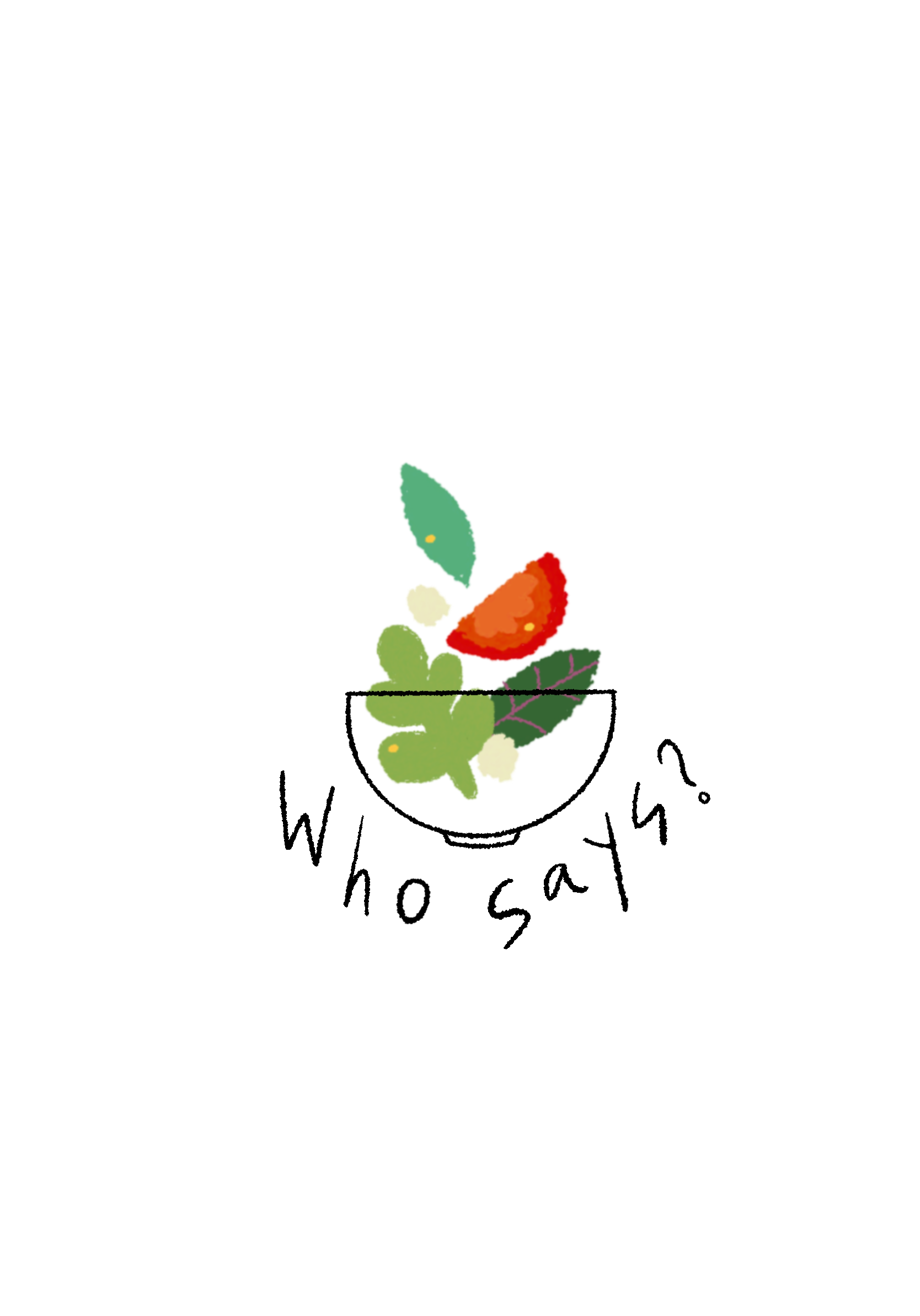 The Who Says? logo features a salad bowl with vegetables falling into it, symbolising the app's inclusivity. The mix of ingredients represents the variety of tastes and preferences the platform caters to, highlighting its focus on customisation and diversity.